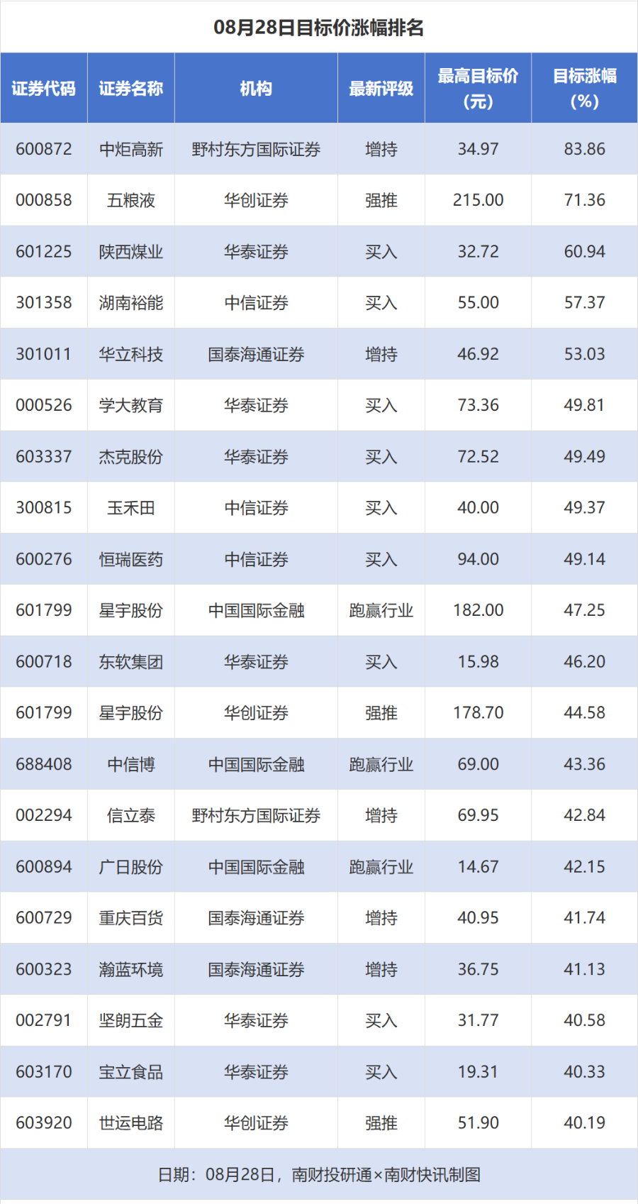 南财投研通数据清楚,8月28日,券商予以上市公司办法价共225次,按最新收盘价计较,办法价涨幅名次居前的公司有中炬高新、五粮液、陕西煤业,办法价涨幅永诀为83.86%、71.36%、60.94%,永诀属于调味发酵品、白酒、煤炭拓荒行业。
