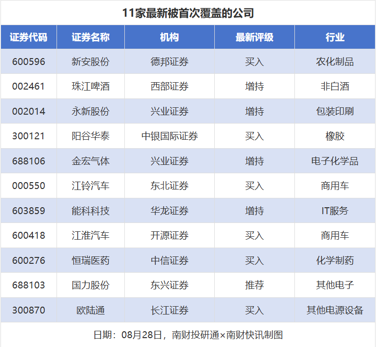 初度秘籍方面,8月28日券商共给出了11次初度秘籍,其中新安股份赢得德邦证券予以“买入”评级,珠江啤酒赢得西部证券予以“增捏”评级,永新股份、金宏气体赢得兴业证券永诀予以“增捏”“增捏”评级,阳谷华泰赢得中银外洋证券予以“买入”评级。
