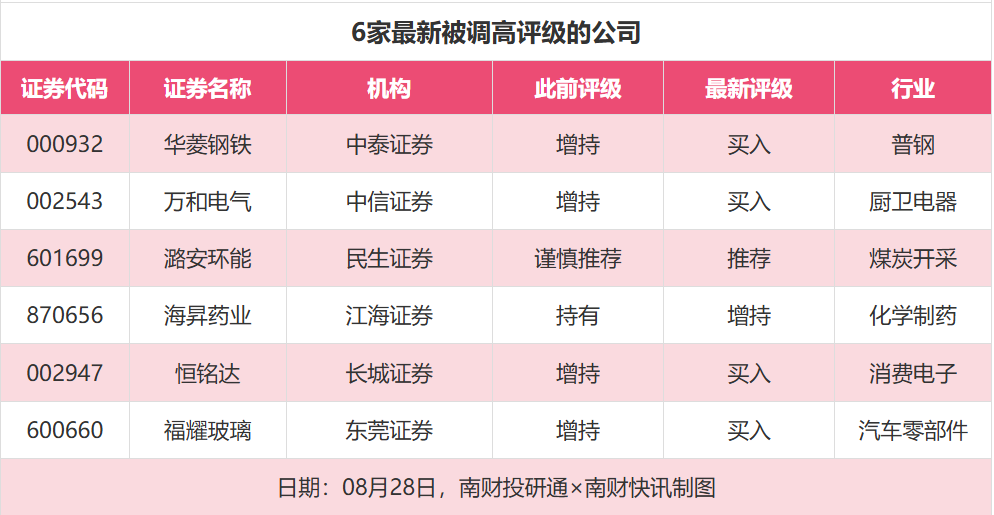 评级调高方面,8月28日,券商调高上市公司评级达到6家次,最新数据包括了中泰证券对华菱钢铁的评级从“增捏”调高至“买入”,中信证券对万和电气的评级从“增捏”调高至“买入”,民生证券对潞安环能的评级从“严慎保举”调高至“保举”。